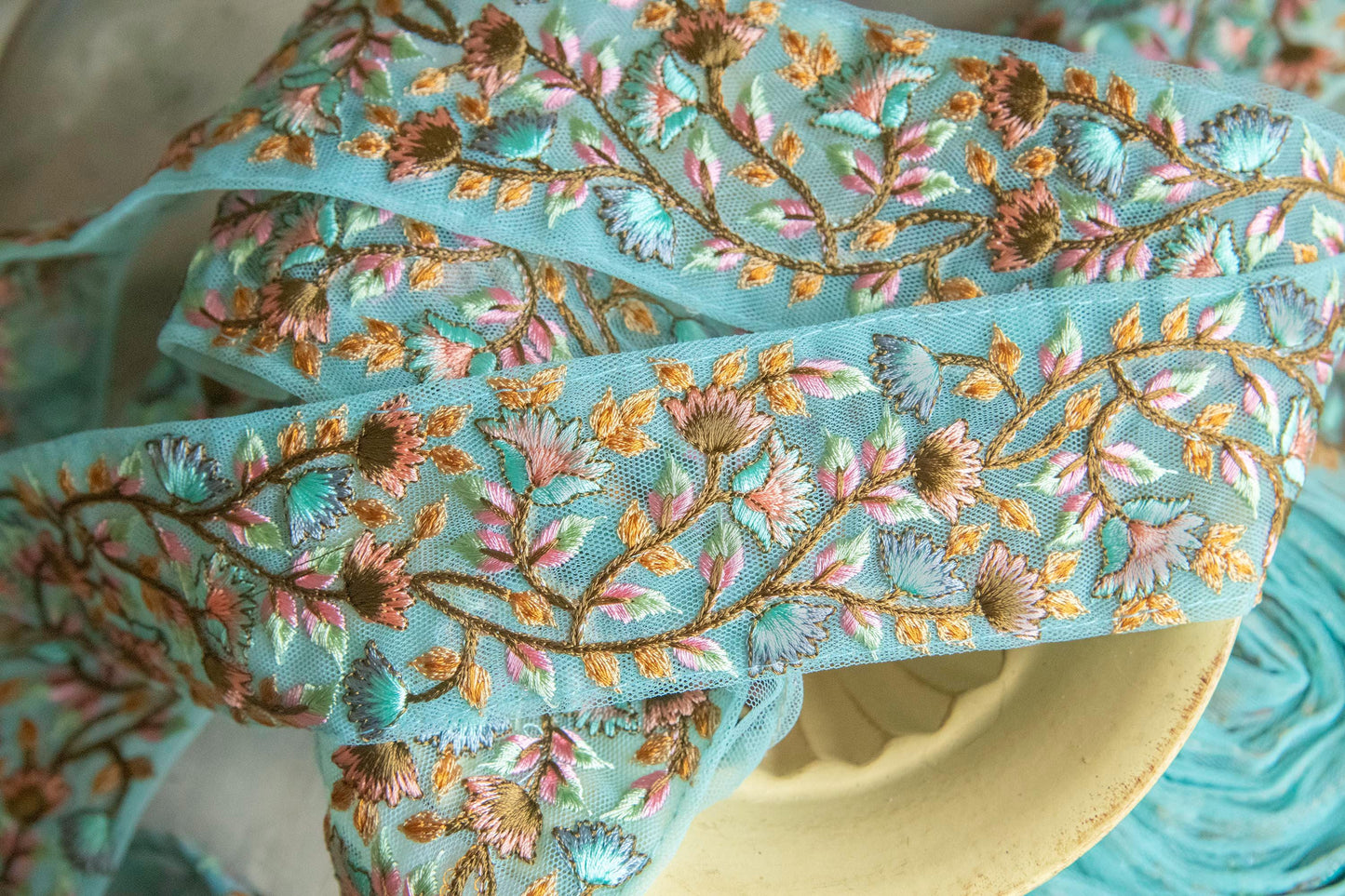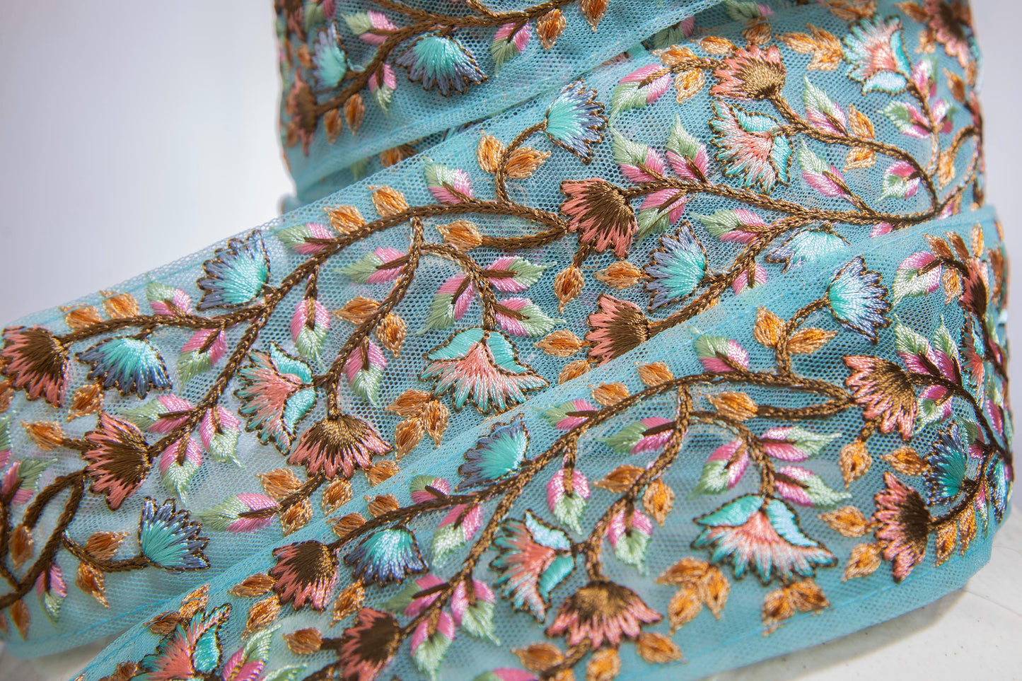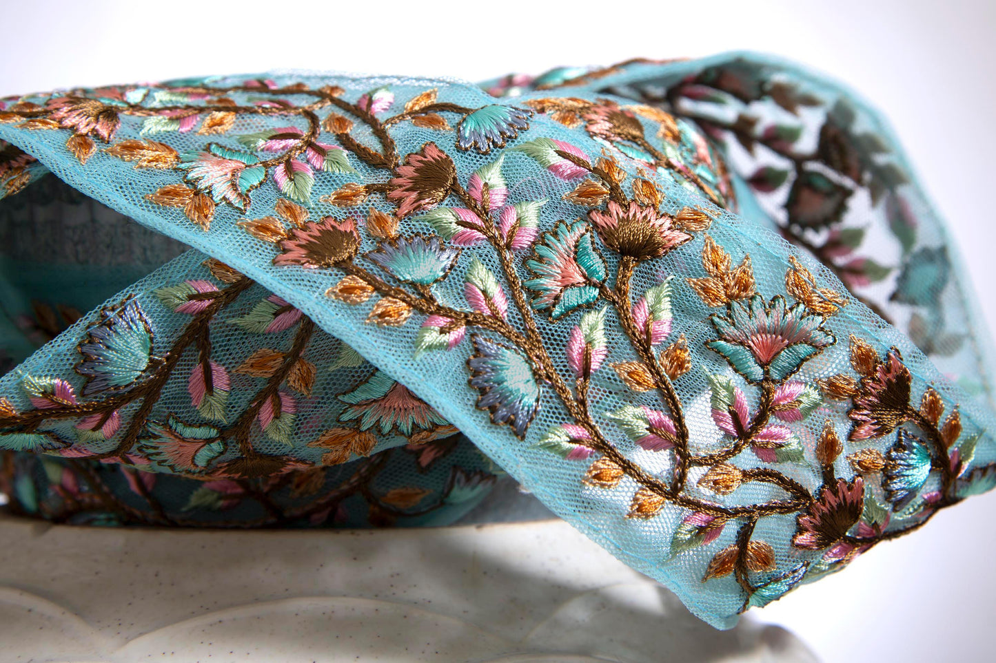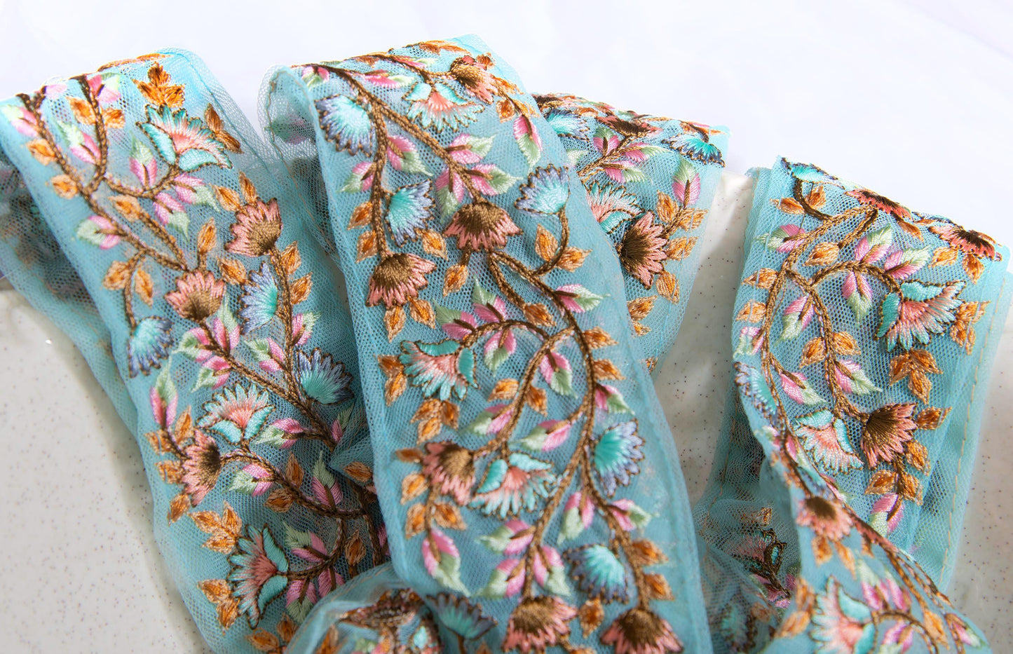 Listing is for a ribbon with Aqua blue floral-orange pink thread embroidery ribbon on mesh fabric