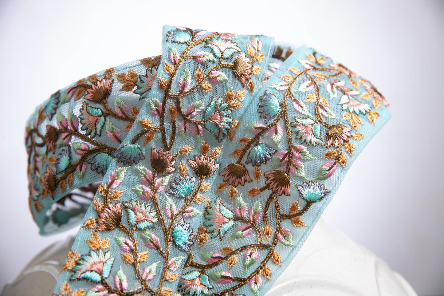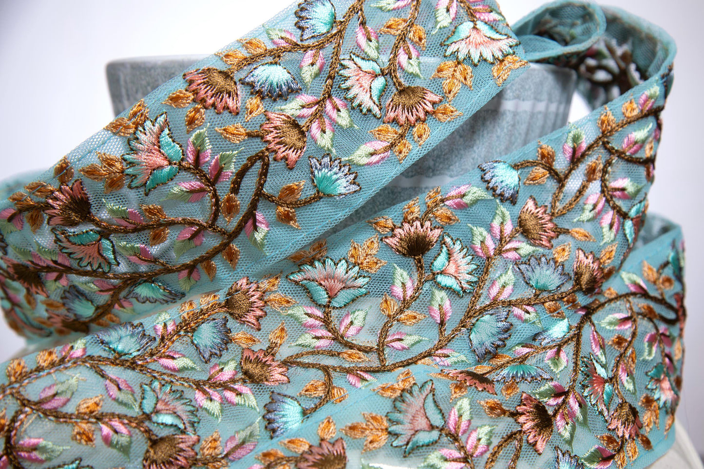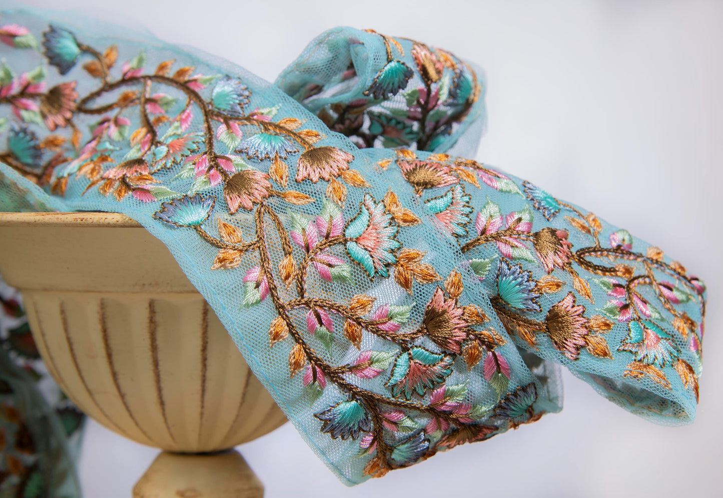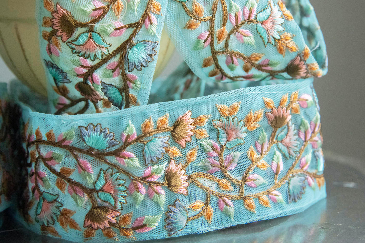 Listing is for a ribbon with Aqua blue floral-orange pink thread embroidery ribbon on mesh fabric