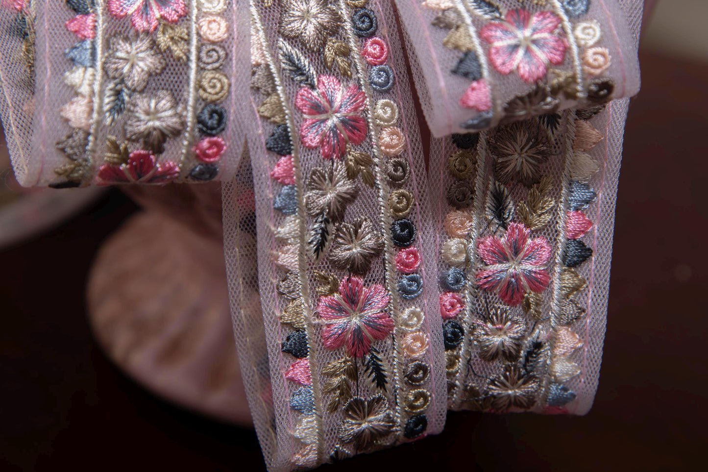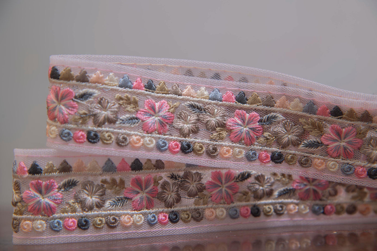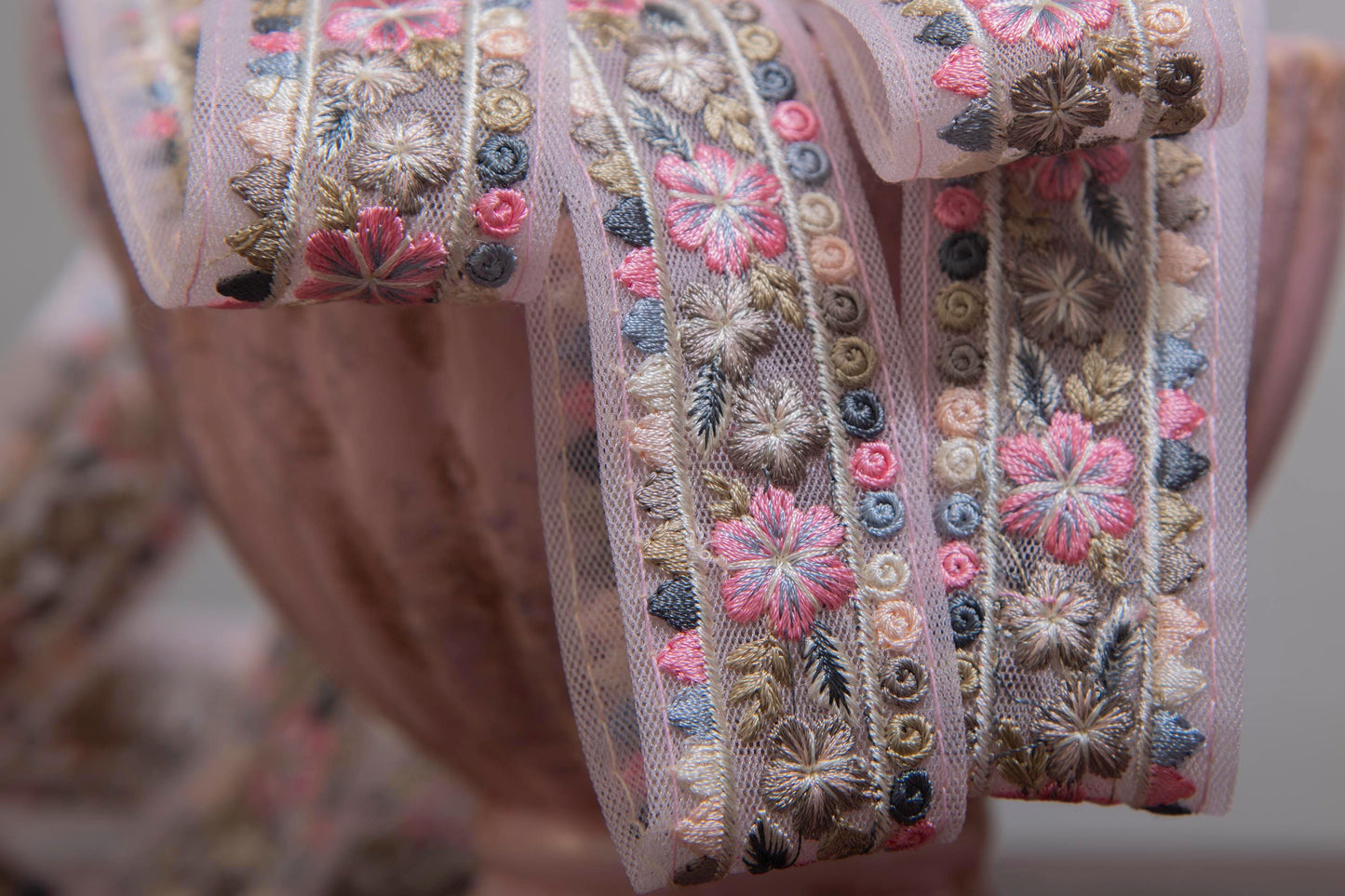 Listing is for a ribbon with Baby pink and blue pastel floral thread embroidery ribbon blush pink mesh
