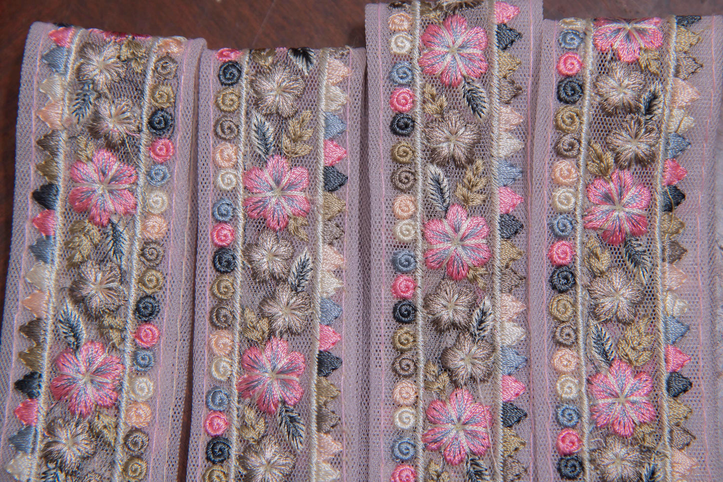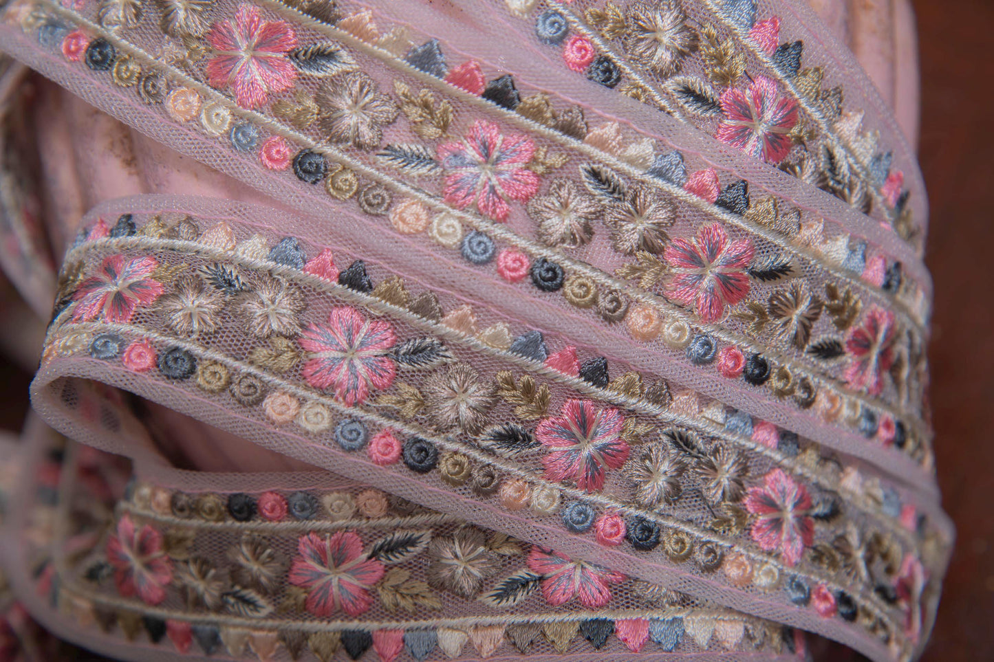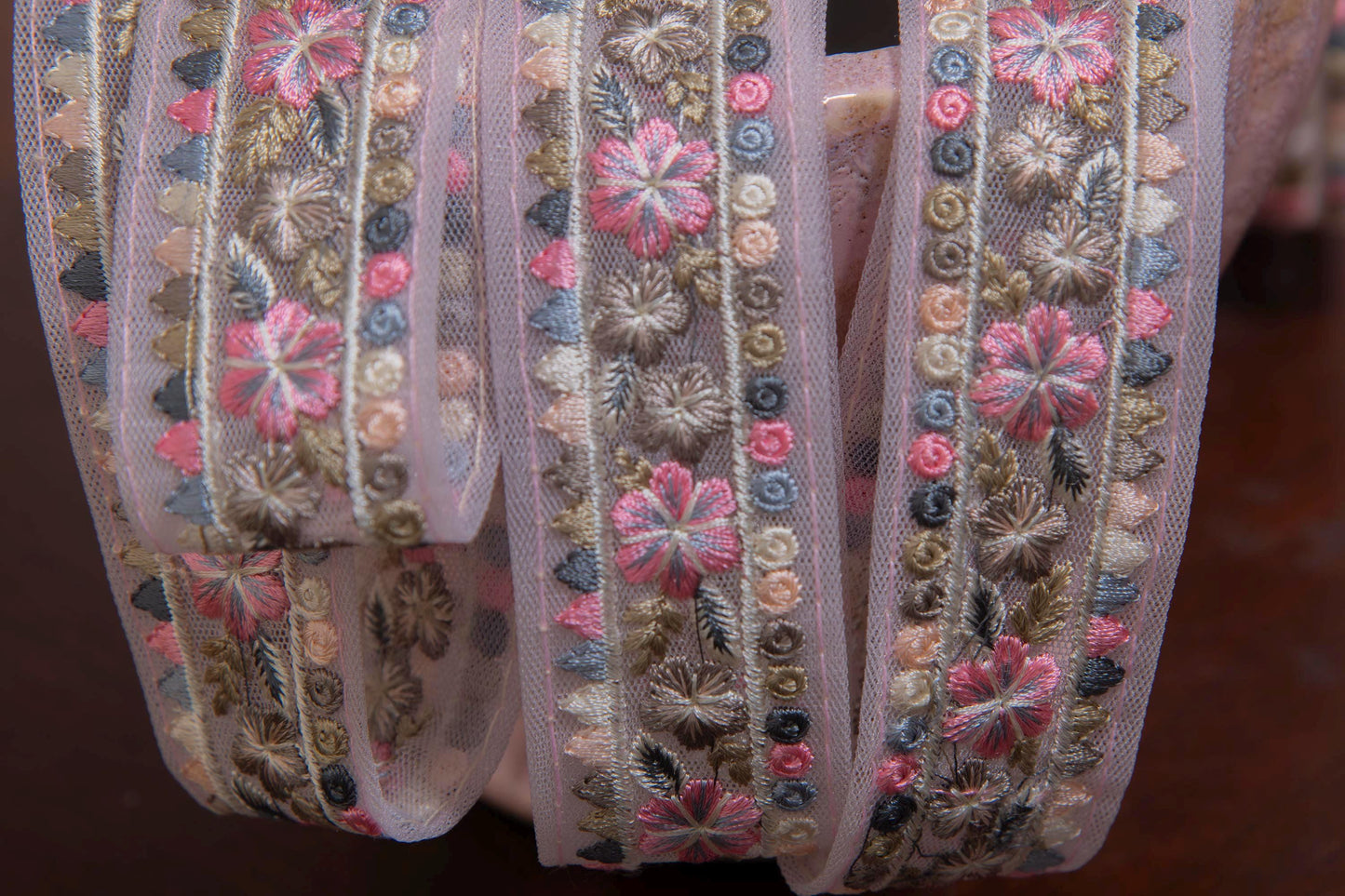 Listing is for a ribbon with Baby pink and blue pastel floral thread embroidery ribbon blush pink mesh