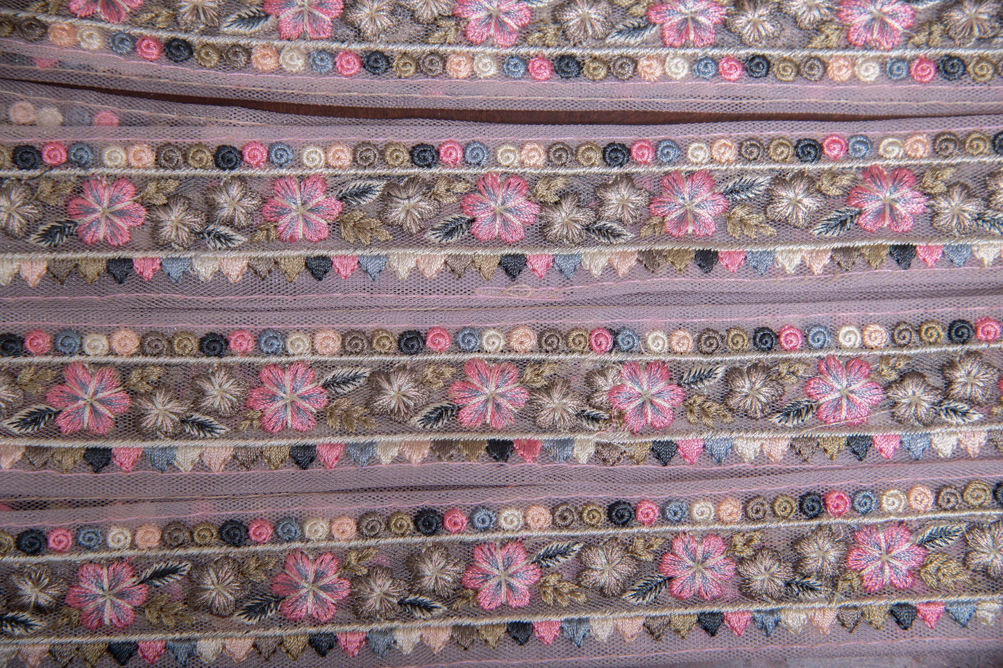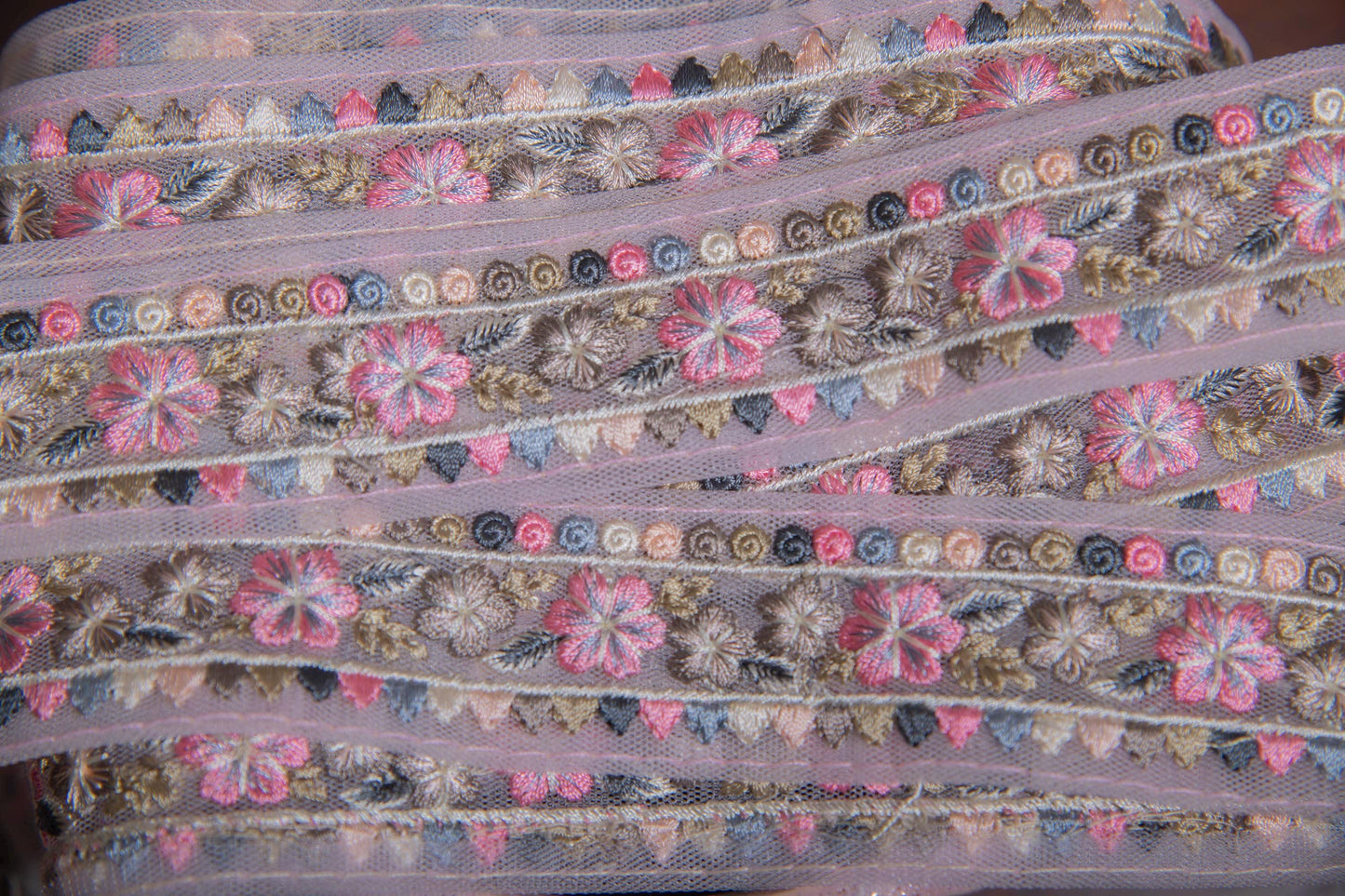 Baby pink and blue pastel floral thread embroidery ribbon blush pink mesh fabric