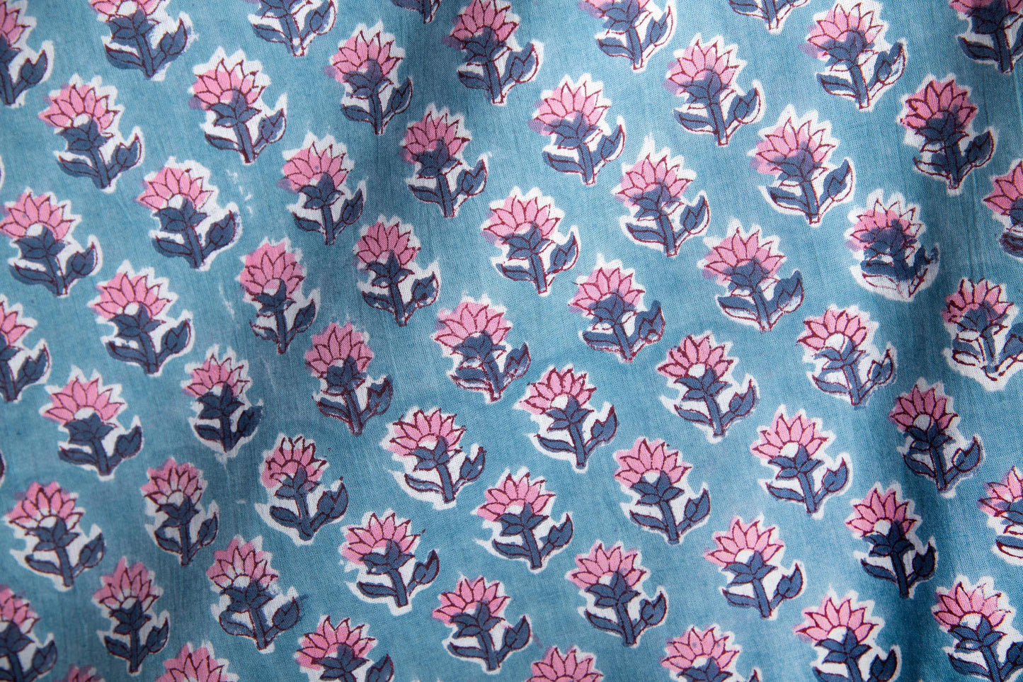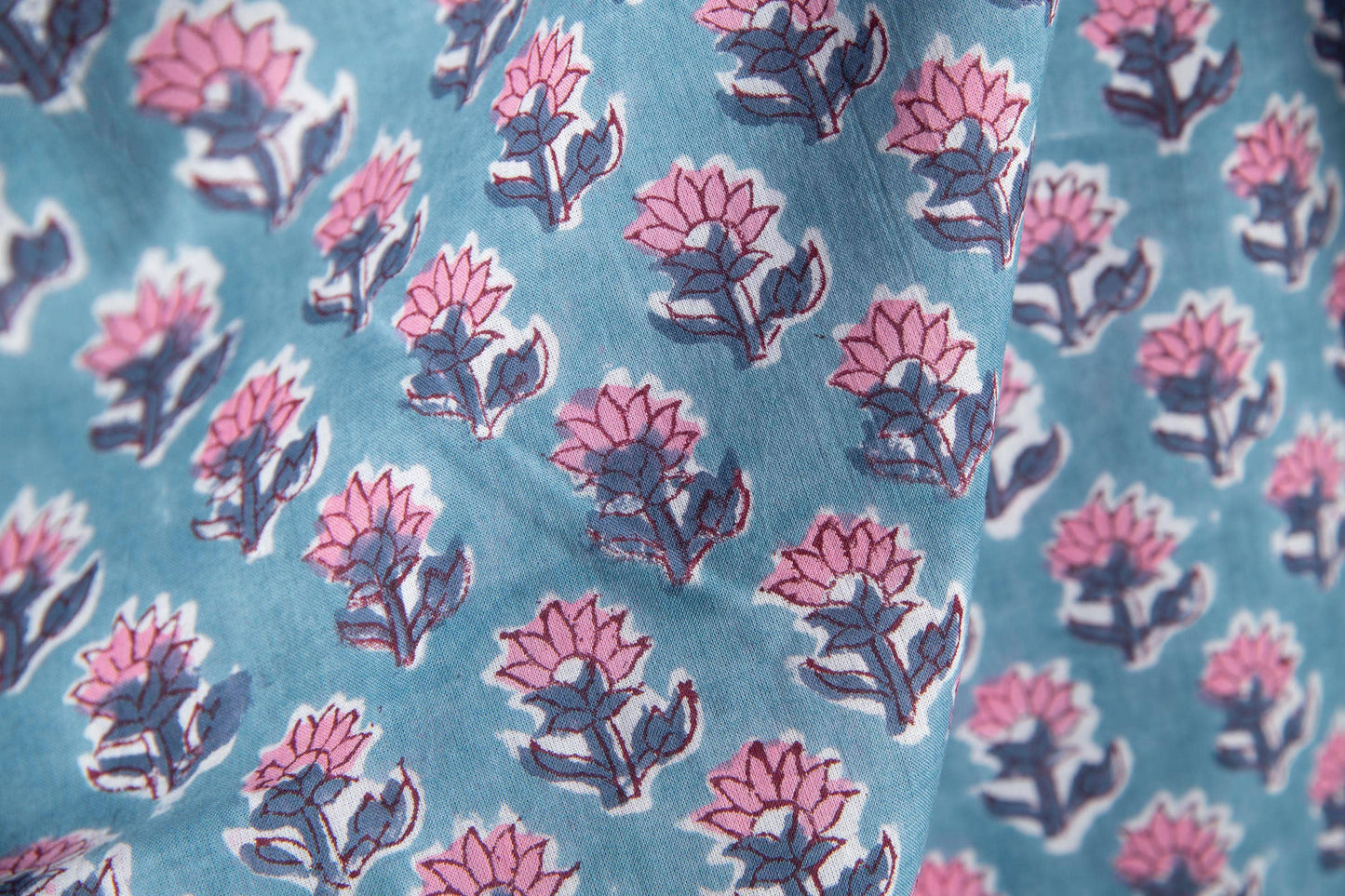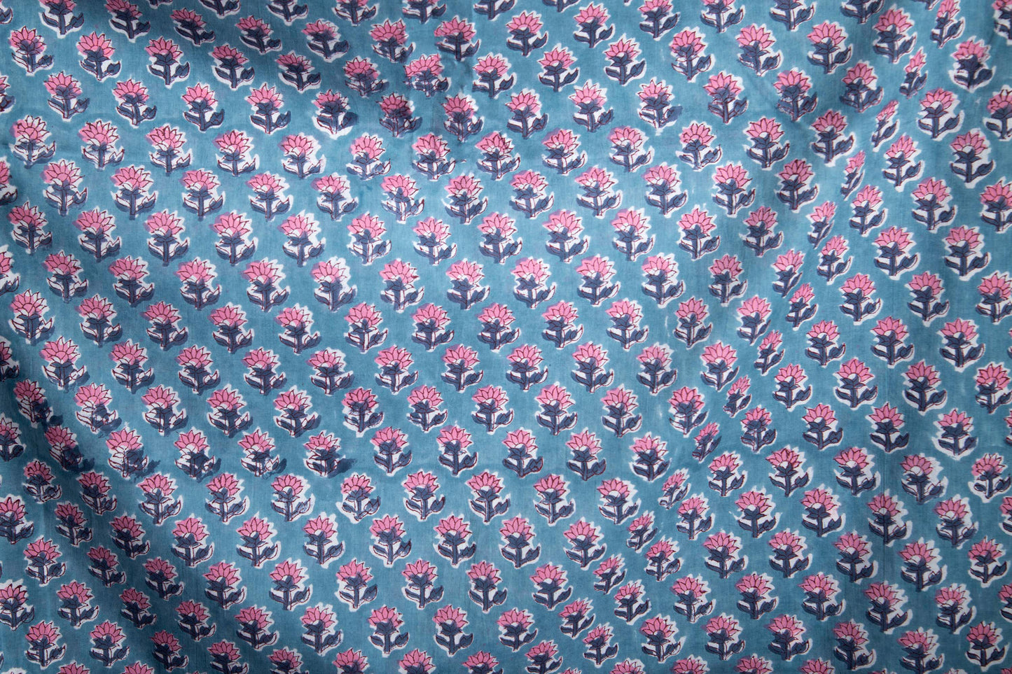 Teal blue with pink flower motifs hand block printed cotton fabric