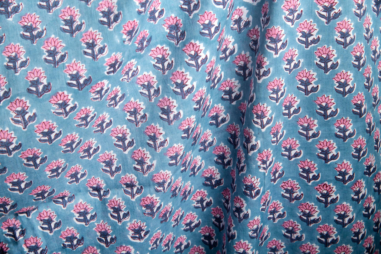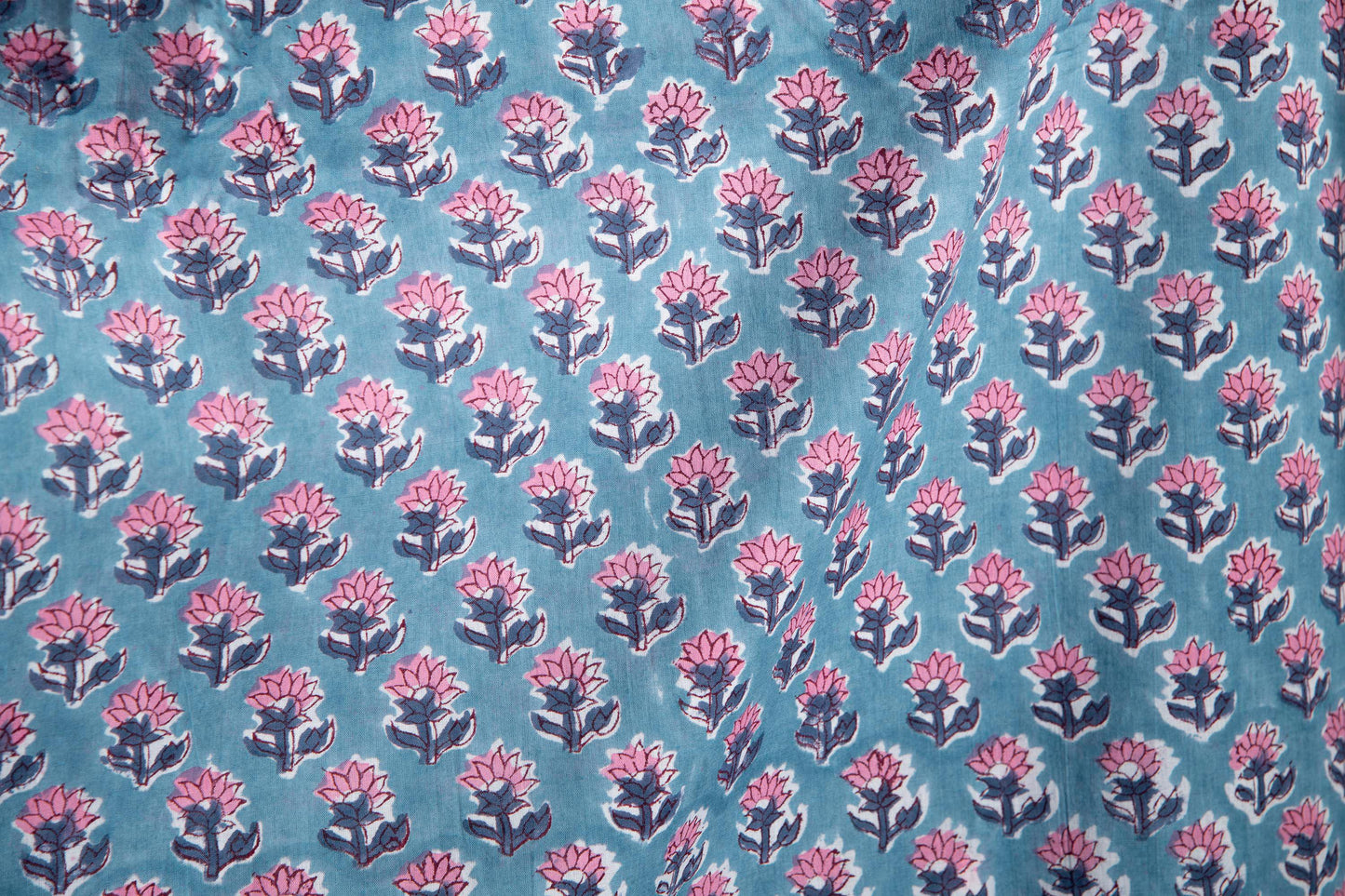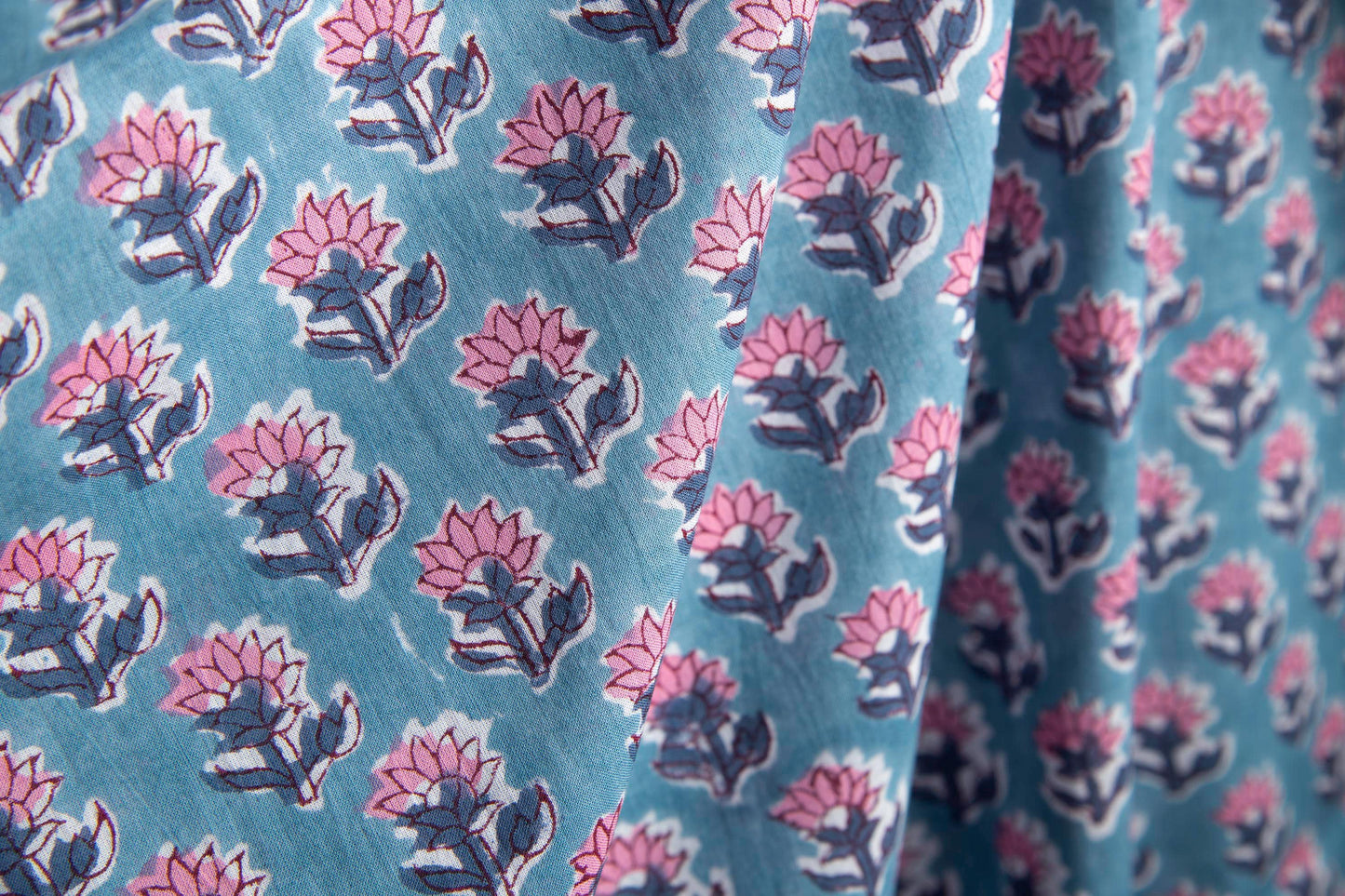 Teal blue with pink flower motifs hand block printed cotton fabric