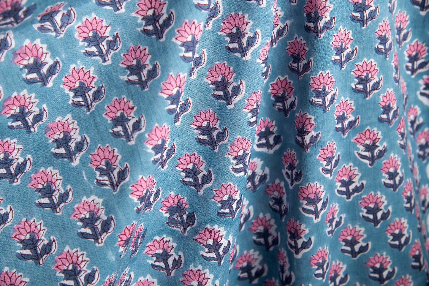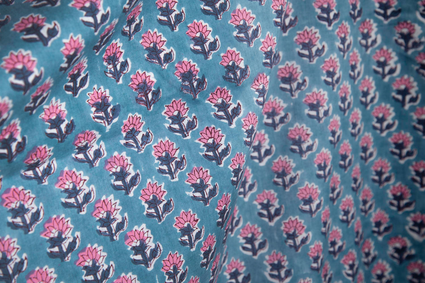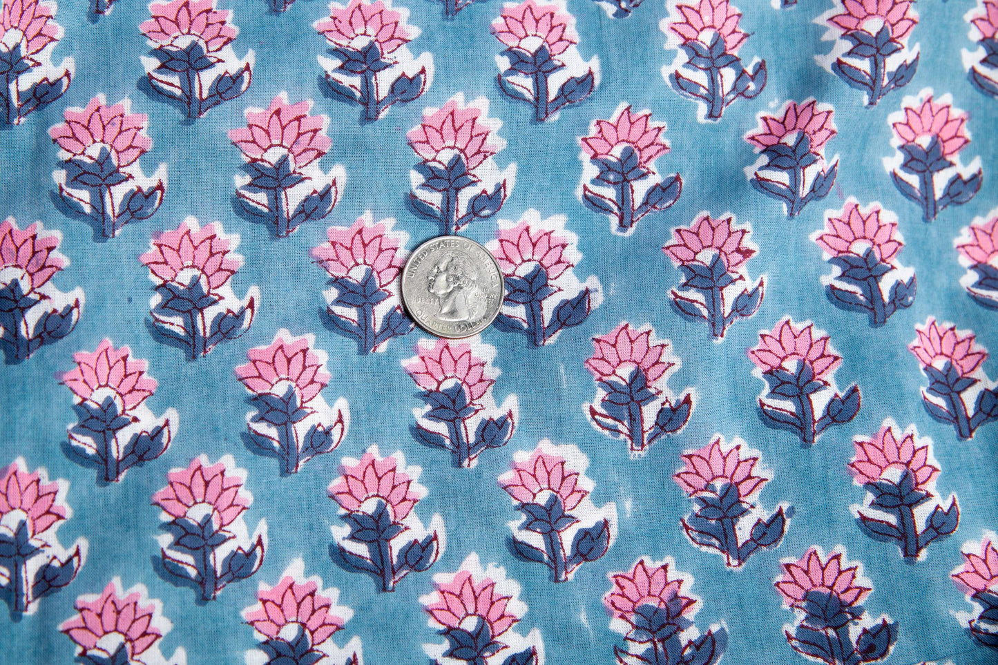 Listing is for a Teal blue with pink flower motifs hand block printed cotton fabric perfect for quilted projects, dresses and home decor