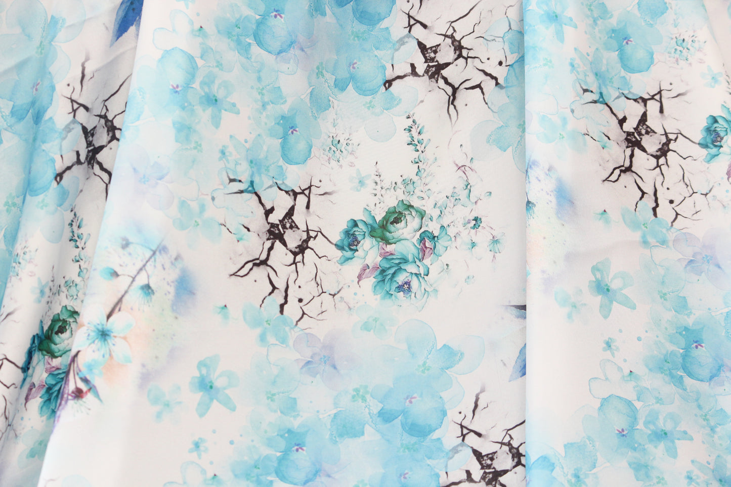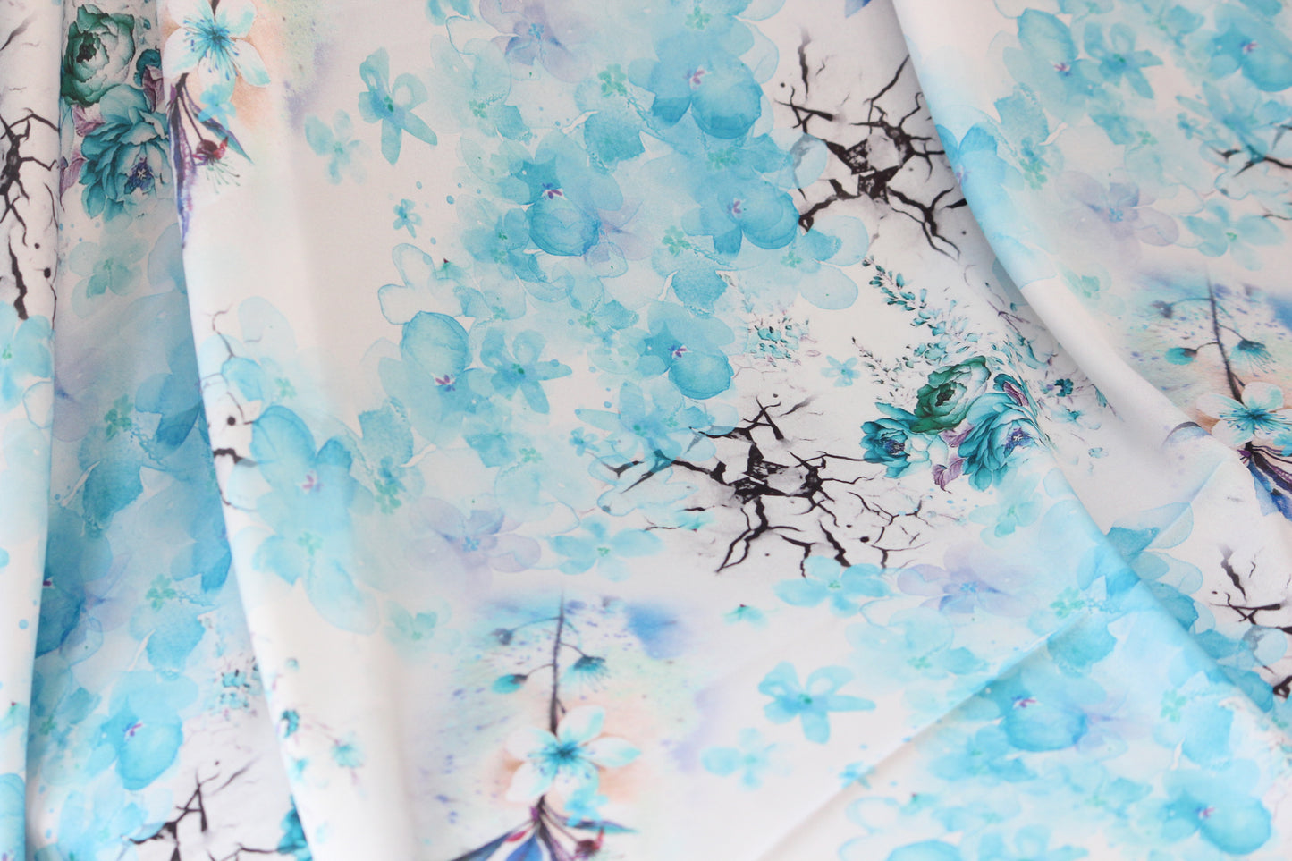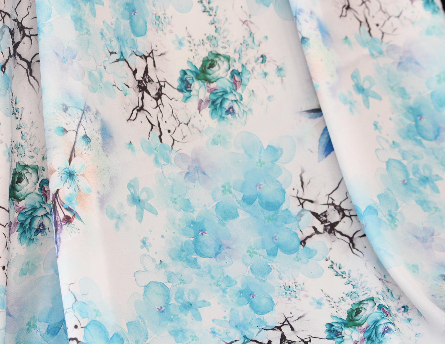 White and ice aqua blue green satin charmeuse- aqua blue and green stunning rose abstract print satin fabric