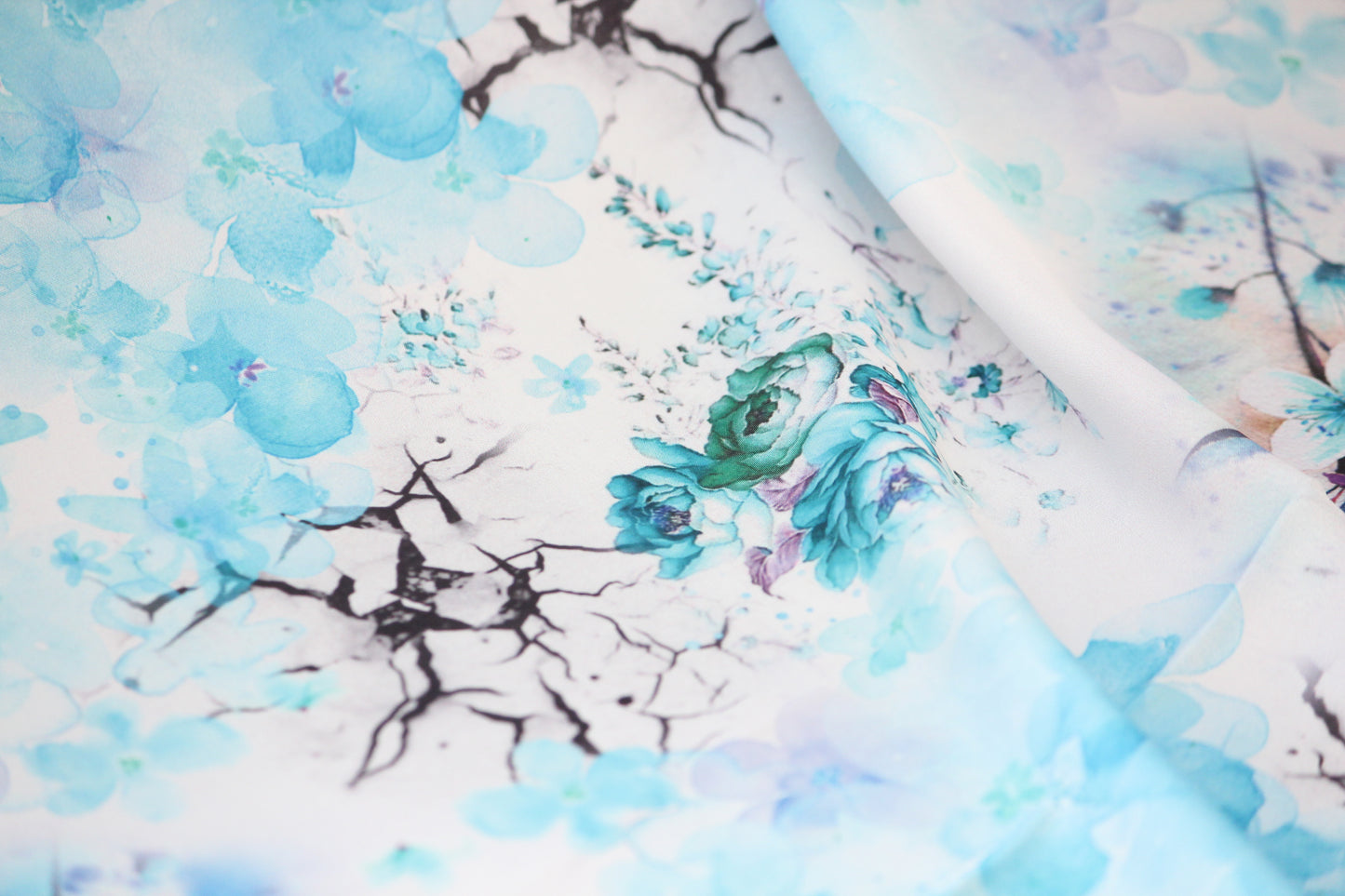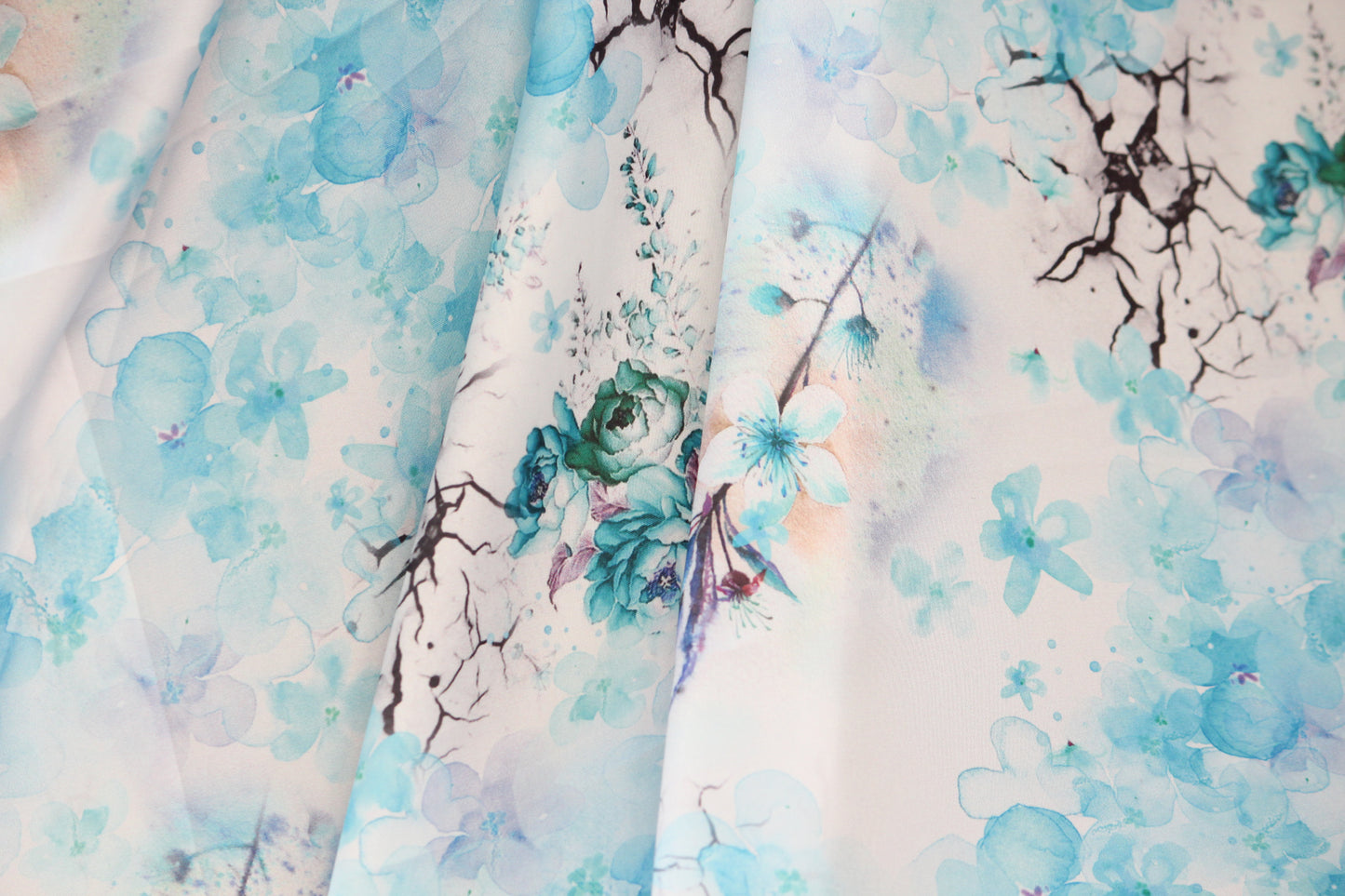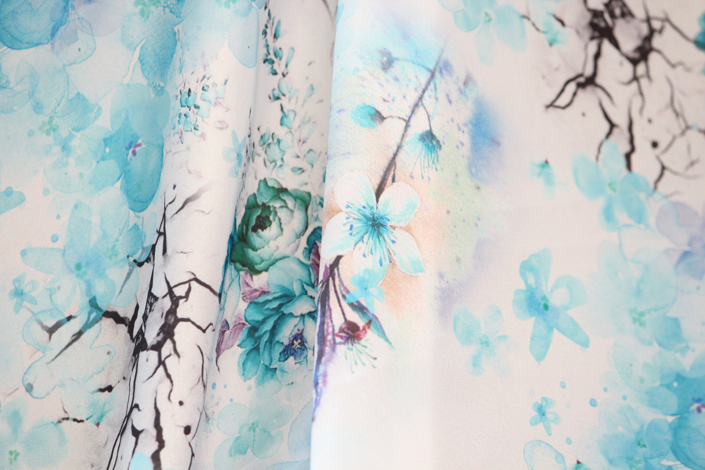 White and ice aqua blue green satin charmeuse- aqua blue and green stunning rose abstract print satin fabric