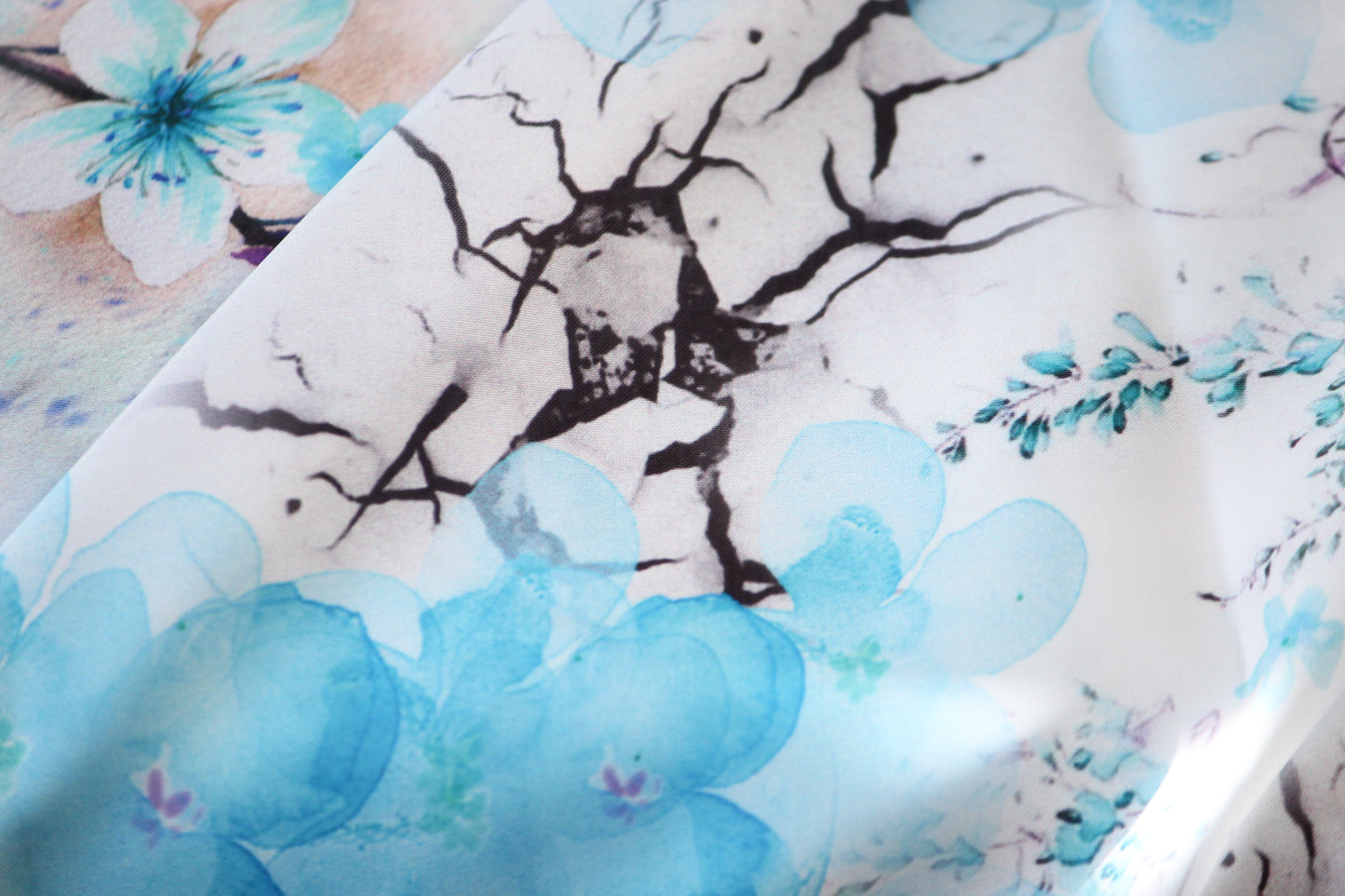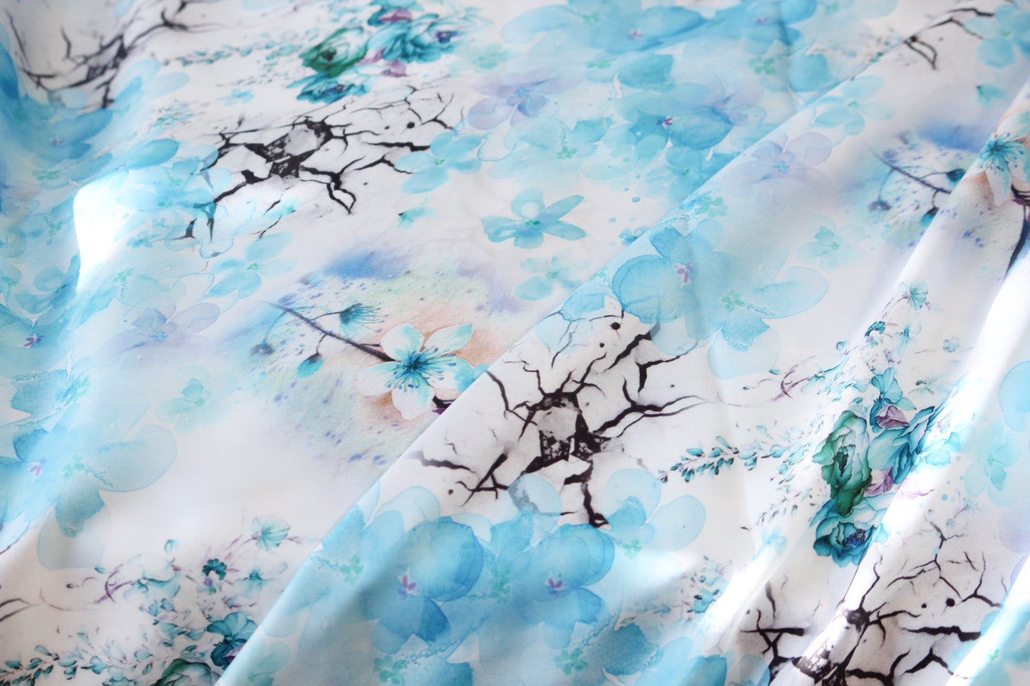 Listing is for a matte finish soft satin charmeuse fabric in shade of sky blue/ice blue and light grey with white background. Great for skirts and blouses! Satin charmeuse. This fabric has amazing drape